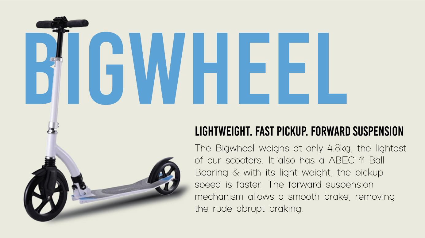 Perfect for short urban journeys and outing. FASTER, FURTHER, and MORE COMFORTABLY for teenage to adult . The Big Wheel scooter has front suspension and big wheels. What's more, the compact and lightweight, take it everywhere you can!