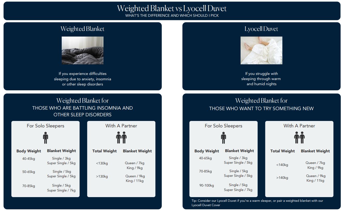 NOTE: We recommend that you select one that is up to 10% of your body weight, or 7% of the combined weight of you and the person you are sharing it with. if you are in between sizes, go for the lighter option. Do chat with us if you are unsure.