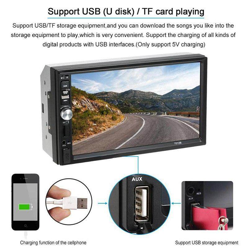 Features: Color: Black Model: 7012B 3rd Material: Plastic + Metal Screen type: TFT Screen size: 7 inch Resolution: 800x480 Power supply voltage: DC 12V Horn impedance: 4 ohms Maximum power: 50W x 4 Volume control: ±8 dB (bass 100HZ, treble 10KHZ) Function: Bluetooth, charger, MP3 players, radio tuner, touch screen, rear view 7'' HD TFT display screen With rear view function Support SD card, U disk play Any state of power failure memory function Built-in Bluetooth function, can match the smart phone Built-in radio AM / FM tuner, automatic search platform function Supports playback of AVI / JPEG / WMA / MP3 / format programs EQ sound control, stereo, left channel, right channel selection/Andriod /IOS Mirror Link Package : 1 x 7012B 3rd Car Radio Player 1 x Remote Controller 1 x Cables Kit 1 x Manual Note: This machine is 12V machine, not according to the 24V power supply