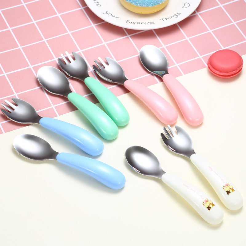 Mododo 2pcs/Set Spoon Forks Portable Children 1Box Kids Cutlery 304 Stainless Steel Tableware Baby Feeding Utensils Cartoon Pattern