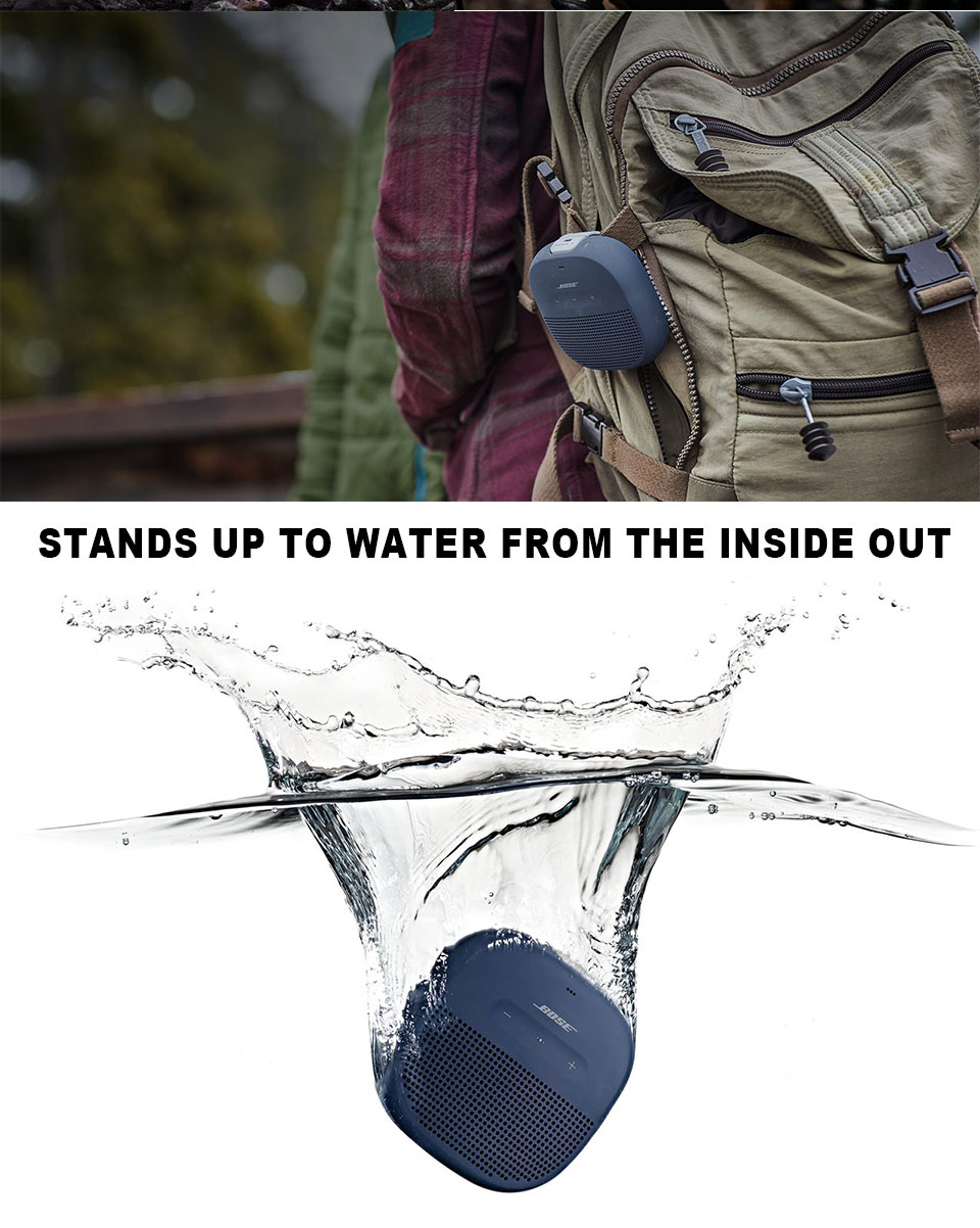 When a portable speaker is this small and powerful, you'll never leave it behind. So when adventure is calling, grab the SoundLink® Micro Bluetooth® speaker on your way out the door and make the best of every moment. This small speaker is at home in your hand. And it delivers crisp, balanced sound and unmatched bass for its size. Bose did it with a custom mounted transducer and passive radiators that produce sound that's loud and clear—even outside.