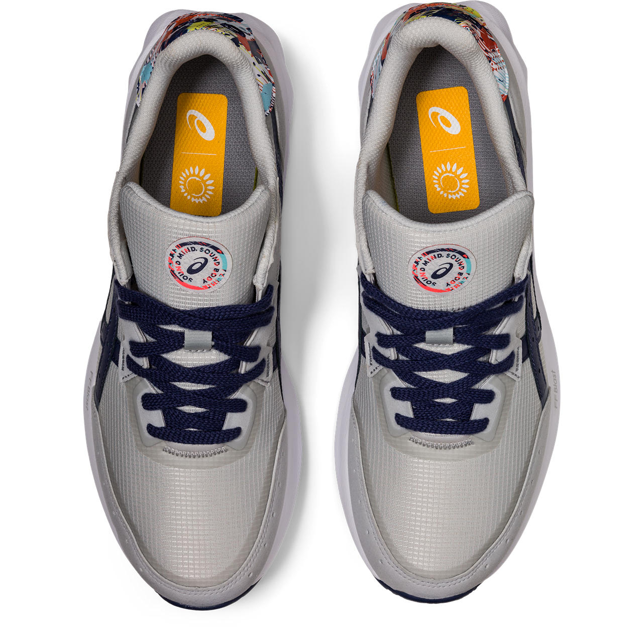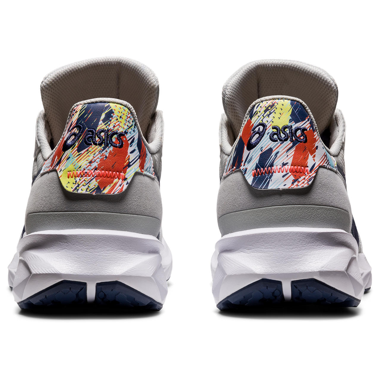 These shoes feature a hexagonal pattern that represents the body's strength, while the vibrant splashes of color symbolize the mind.