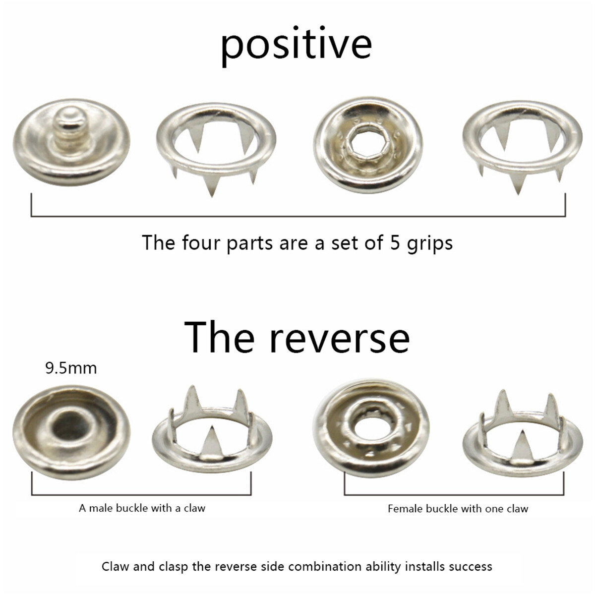 1. 100PCS is 100 accessories, actually 25 sets of buttons, a set of buttons consists of 4 parts, which are 2 hollow circles with claws, one male button and one female button