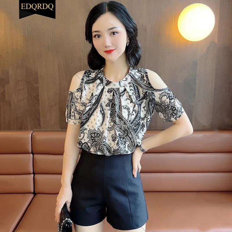 EDQRDQ Women's Cold Shoulder Summer Shirts O Neck Tops Short Sleeve Floral Flowy Chiffon Shirts