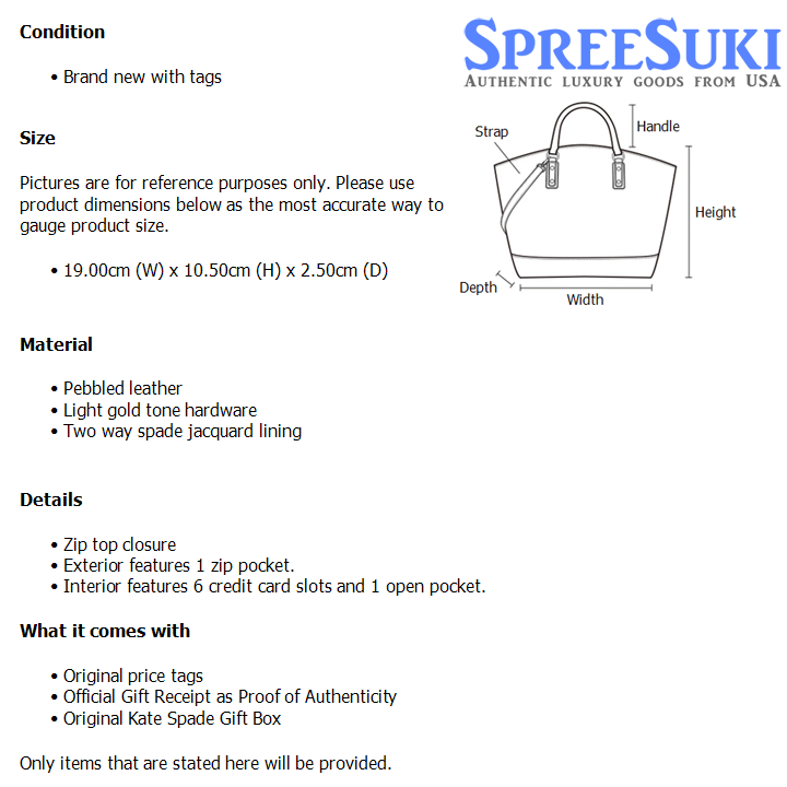 All our products are 100% authentic and purchased from Kate Spade stores in USA. We are a reputable registered business in Singapore and it is illegal to sell counterfeit goods in Singapore. This product also comes with a gift receipt which is printed by the Kate Spade store that we purchased the item from. It states the item that we purchased and the Kate Spade store that it was purchased from, proving the authenticity of the item. Buy with confidence.
