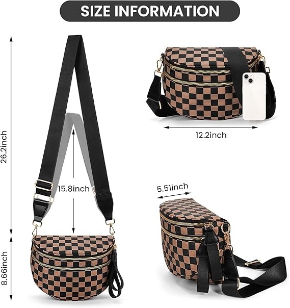 ✔️[Dimensions and Capacity]: The checkered waist bag measures 12.20 x 5.51 x 8.66 inches, making it suitable for everyday items like a phone, wallet, keys, and a Stanley water bottle. A zippered pocket on the back provides storage for important items.