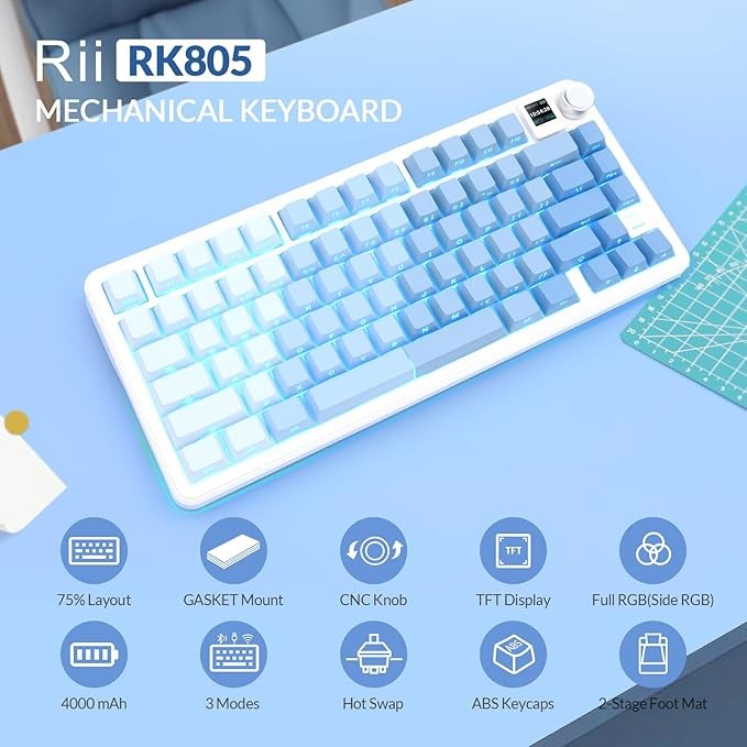 75% Mechanical Keyboard with Gasket Mount:The Rii RK805 utilizes a 75% compact layout and gasket mount construction. The gasket design features 4 layers of sound-absorbing foam, allowing the keyboard to effectively reduce noise, minimize noise interference, enhance sound quality, and enable full-key anti-ghosting, creating a comfortable typing experience for you. The keyboard color scheme adopts a unique visual scheme with gradient blue to bring you a novel experience